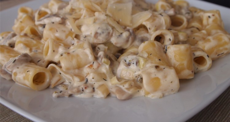 makaron z porem i pieczarkami